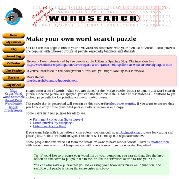 Create My Word Search. Spaces will be removed when words are added to the word search grid. To make a word search, enter your list of words in the large area provided.