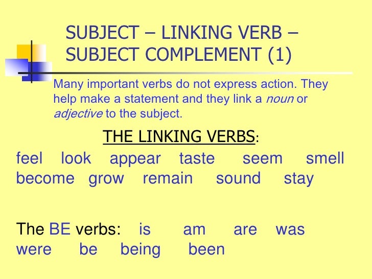 Some verbs are ALWAYS linking verbs because they never describe an action. A linking verb is a type of verb that joins the subject of a sentence to a word or phrase that tells something about the subject. A linking verb differs from an action verb as it does not indicate what the subject does but what The most common linking verbs are the various forms of the auxiliary verb to be: am, is, are, was, were, be, being, been, seem, become, and verbs.