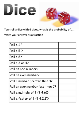 Dice and cards probability short worksheets by moth754 ...